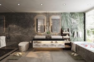 Dù không gian biệt thự có rộng lớn đến đâu thì không gian phòng tắm cũng nên được thiết kế với diện tích phù hợp, vừa vặn với các thiết bị cần thiết. Không gian phòng tắm và phòng ngủ nên đặt xa để tránh không khí ẩm ướt làm ảnh hưởng đến giấc ngủ của bạn.