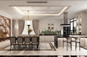 Thiết kế nội thất phòng bếp biệt thự tiện nghi với hệ thống bàn ăn sang trọng