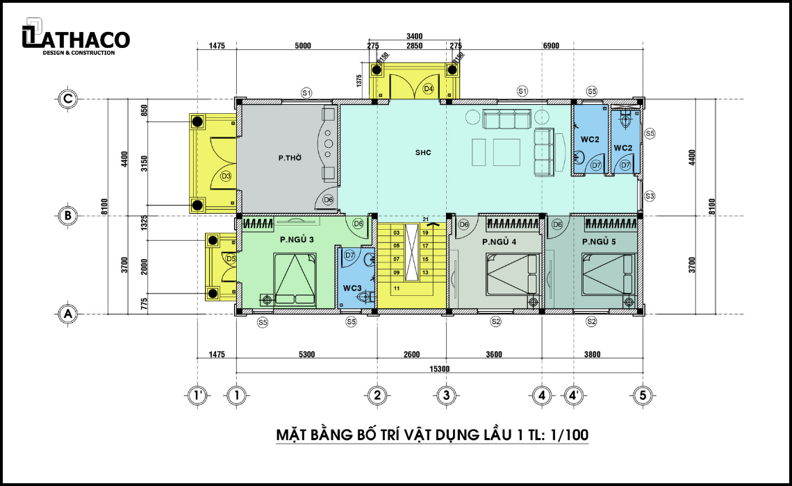 Kết cấu lầu 1: gồm phòng thờ, phòng sinh hoạt chung, 3 phòng ngủ, 2 WC.