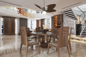 Đối với thiết kế nội thất nhà biệt thự thông thường tầng trệt bố trí phòng khách và phòng bếp, khu vực ăn uống. Căn phòng bếp, bàn ăn sẽ được thiết kế liên thông với nhau tạo “không gian mở” rộng rãi, thoáng mát.