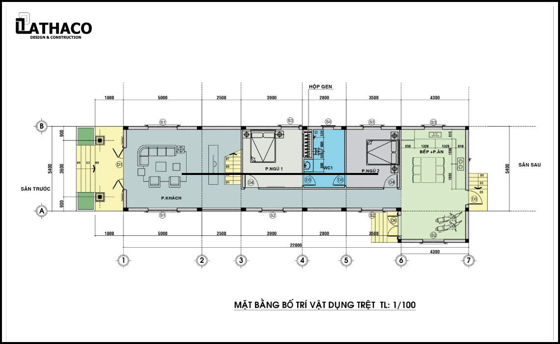 Tầng một mặt bằng nhà 5,4x24m 1 trệt 1 lầu bao gồm: sân trước, phòng khách, phòng bếp + ăn, phòng ngủ, WC chung.