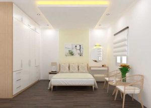 Ngoài sự yên tĩnh, riêng tư cần thiết, không gian phòng ngủ cũng đòi hỏi tính thẩm mỹ, các đồ nội thất cần được lựa chọn kỹ càng nhằm đảm bảo sức khỏe cho chủ nhân căn phòng. Chính vì vậy, chủ nhân của ngôi nhà đã sử dụng toàn bộ sàn gỗ cho phòng ngủ, đem đến sự gần gũi ấm áp trong không gian.