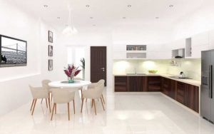 Sự pha trộn giữa màu trắng và màu gỗ giúp cho căn phòng bếp trở nên sang trọng và ấm cúng. Thiết kế tủ bếp chữ L ôm sát tường nhằm tiết kiệm không gian và bàn ăn tròn đơn giản, gọn gàng tiện cho việc dọn dẹp.