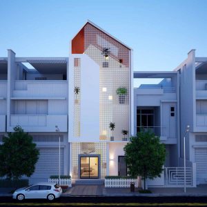 Mẫu nhà phố 3 tầng mái lệch sử dụng gạch thông gió tạo vẻ đẹp ấn tượng